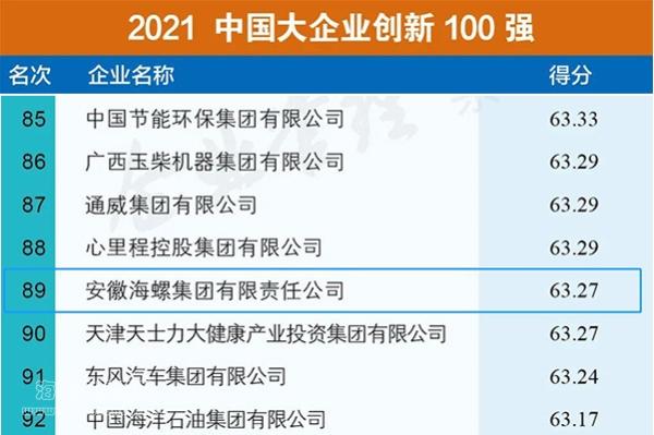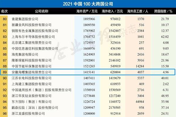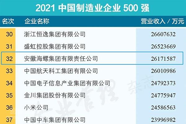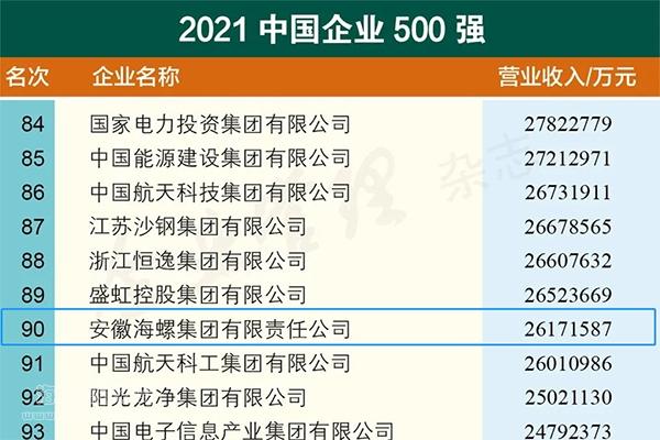 2021年9月24日—25日,2021中國企業(yè)500強高峰論壇在吉林長春舉行,向社會發(fā)布了“中國企業(yè)500強”榜單。海螺集團連續(xù)17年入圍中國企業(yè)500強,榮列2021中國企業(yè)500強第90位,較2020年上升了2位;同時,榮列2021中國制造業(yè)企業(yè)500強第32位;榮列2021中國跨國公司100大第89位,比2020年上升7位;首次登上中國2021大企業(yè)創(chuàng)新100強榜單,名列第89位。