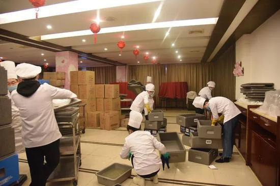 同時,遠在400公里外的武漢,早上5點,天尚未亮,艷陽天彭劉楊路店的后廚卻已是熱火朝天。廚師們正在為洪山體育館方艙醫院配餐。蒸雞蛋、蒸香腸、紅糖發糕、小肉包、花卷、新鮮水果,師傅們還特地制作了湯圓,寓意“早日團圓”……為了讓大家吃得更貼心更舒服,每天的早餐都會配有干食和稀食。