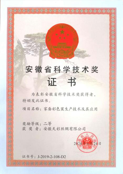 安徽省科學(xué)技術(shù)獎是安徽省人民政府對為我省科學(xué)技術(shù)進步、經(jīng)濟社會發(fā)展作出突出貢獻的科學(xué)技術(shù)人員和組織給予的獎勵。此次,天彩絲綢公司參與研究的“家蠶彩色繭生產(chǎn)技術(shù)及其應(yīng)用”項目,榮獲省科學(xué)技術(shù)進步獎二等獎,這也是天彩絲綢公司自成立以來所獲的最高級別科技獎項。